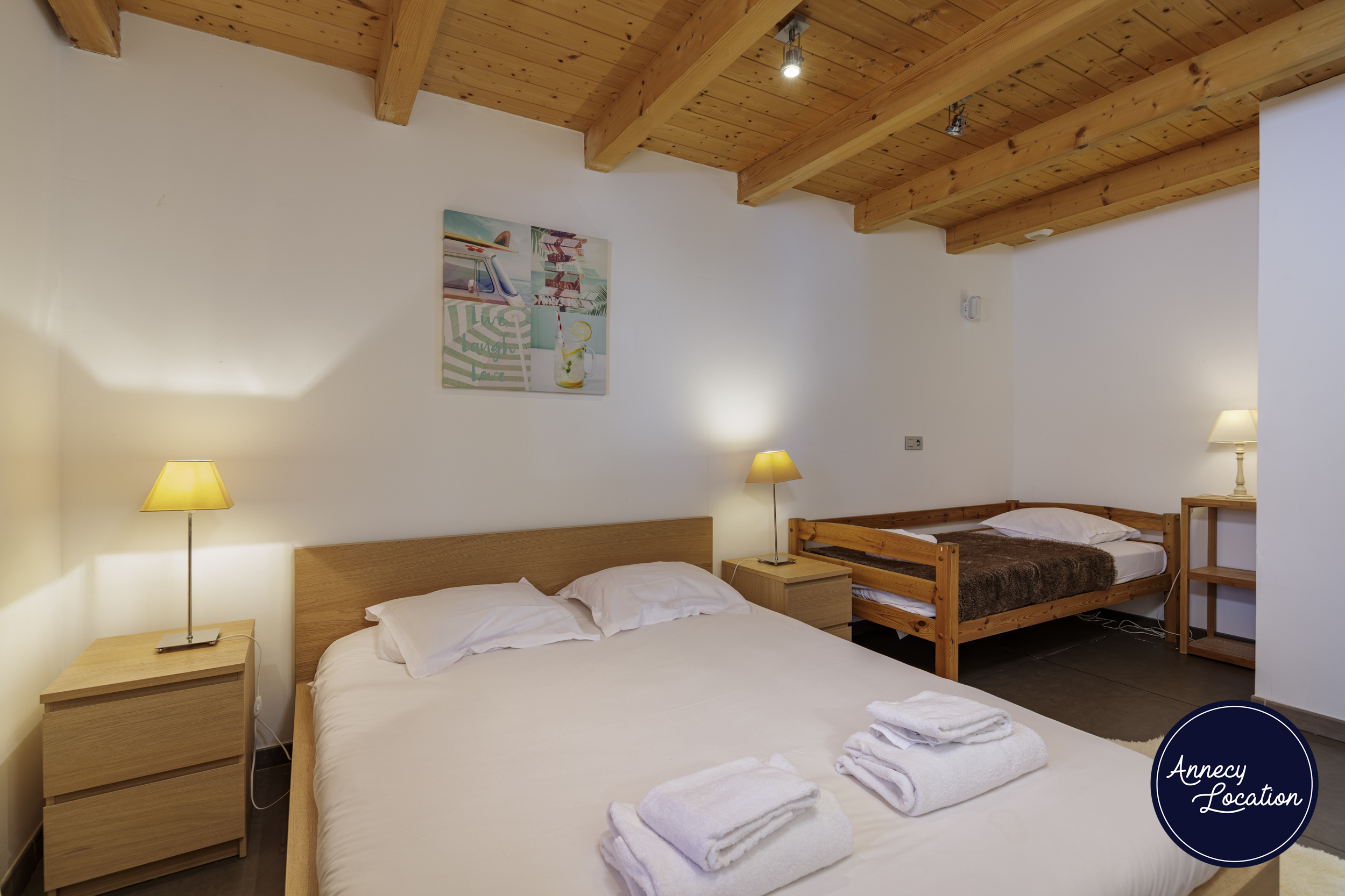 • One large triple bedroom with 1 Queen bed (160×200 cm) + 1 single bed (90×190 cm)